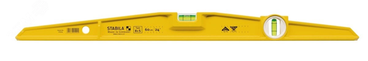 Серия 81 S - для мастеров, которые подвергают инструмент большим нагрузкам, например при каменных работах. Stabila серии 81 S - прочный литой профиль с характерной скошенной формой Прочный алюминиевый профиль (литье под давлением) с узкой и скошенной формой, которая обеспечивает максимальное удобство. Электростатическое специальное порошковое покрытие позволяет легко очистить уровень от загрязнений. Уровень с точно отфрезерованной измерительной поверхностью не оставляет следов на покрытиях, например на гладкой лицевой кладке. Короткие уровни в форме торпеды (тип Torpedo) идеально подходят для использования в узких пространствах. Технология сборки уровней STABILA, гарантирующая точность измерений на протяжении долгого времени. Точность измерения в нормальном положении составляет +- 0,5 мм/м, в перевернутом (над головой) - +- 0,75 мм/м.