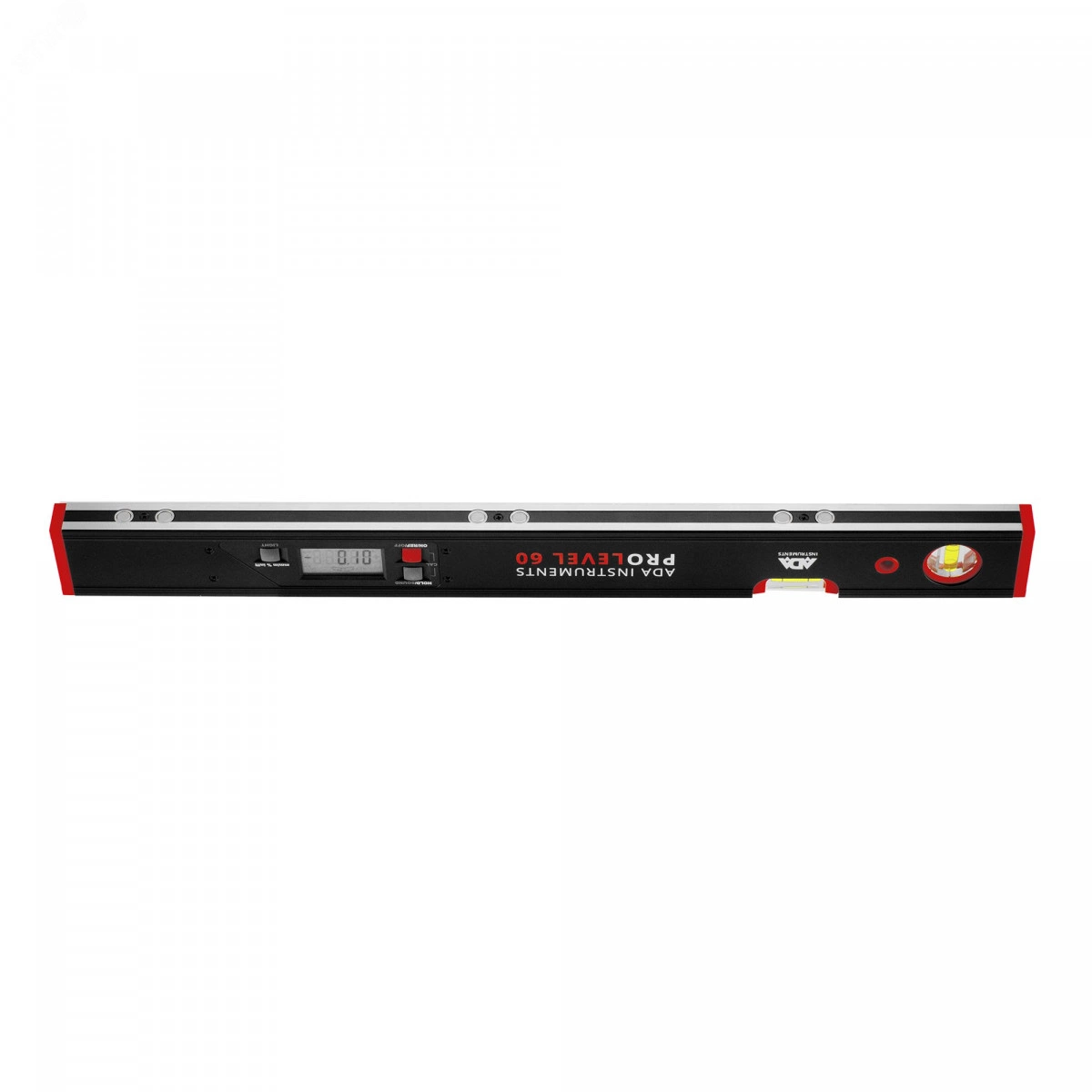 Цифровой уровень ADA ProLevel 60 для измерения углов наклона деталей и плоскостей. Удобно читаемый цифровой электронный дисплей отображает отклонение от горизонтали/вертикали, получая данные с встроенного датчика уклона (инклинометра). Для точной работы есть автоматическая калибровка. Данные отображаются в градусах, мм/м, %, in/ft. Для удобства работы есть режим 'HOLD' - удержания результатов на дисплее и подсветка. Приближение к значениям 0 и 90 градусов сопровождается звуковым сигналом, а на экране появляется электронное изображение пузырькового уровня. Так проще ориентироваться при выставлении этих значений. При измерениях над головой цифры на экране автоматически переворачиваются.Встроенные пузырьковые уровни позволяют вести двойной контроль совместно с электронным датчиком уклона или работать как с обычным уровнем. В основание встроены магниты для крепления на стальных конструкция.