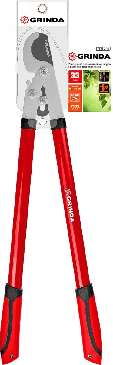 Усиленный плоскостной сучкорез с шестерённой передачей RX-700 удобен в эксплуатации благодаря высококачественной углеродистой стали, удобным рельефным рукояткам, качественному исполнению лезвий. Имеет защитное тефлоновое покрытие лезвия. Предназначен для обрезки веток кустарников или деревьев.