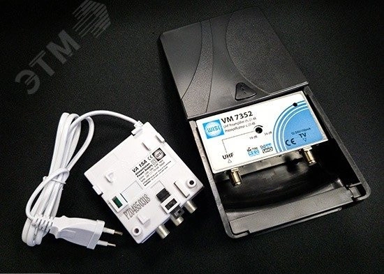 Антенный усилитель ТВ сигнала WISI VM 7352 с БП предназначен для усиления телевизионных сигналов в диапазоне 470 - 694 МГц (21-60 канал). Питание осуществляется по антенному кабелю (24 B DC, 80 мА). Блок питания включает делитель сигнала для подключения двух телевизоров. Конструкция блока питания позволяет крепить его как на стену, так и на DIN-рейку.