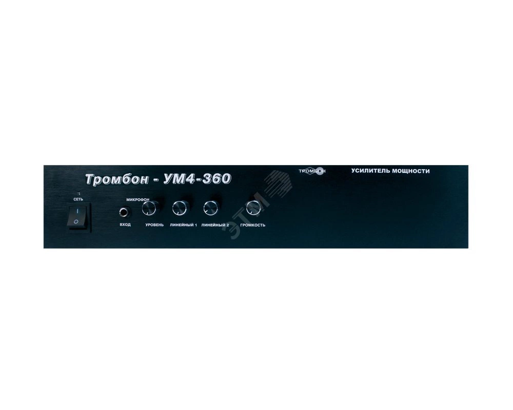 Высокоэффективный импульсный усилитель мощности ''Тромбон УМ-360''. Прибор предназначен для использования в составе систем оповещения людей о пожаре в зданиях и сооружениях. Преимущества - - Четыре входа - ''Линейный вход 1'', ''Линейный вход 2'', ''Оповещение'', ''Микрофон'' - ''Выход оповещения'' для каскадного соединения усилителей в системе оповещения - Регулировка уровня по всем входам (кроме входа ''Оповещение'') - Высокая энергетическая эффективность - Улучшенное звучание - Малые габариты - Облегченная конструкция - Возможность резервирования усилителей мощности