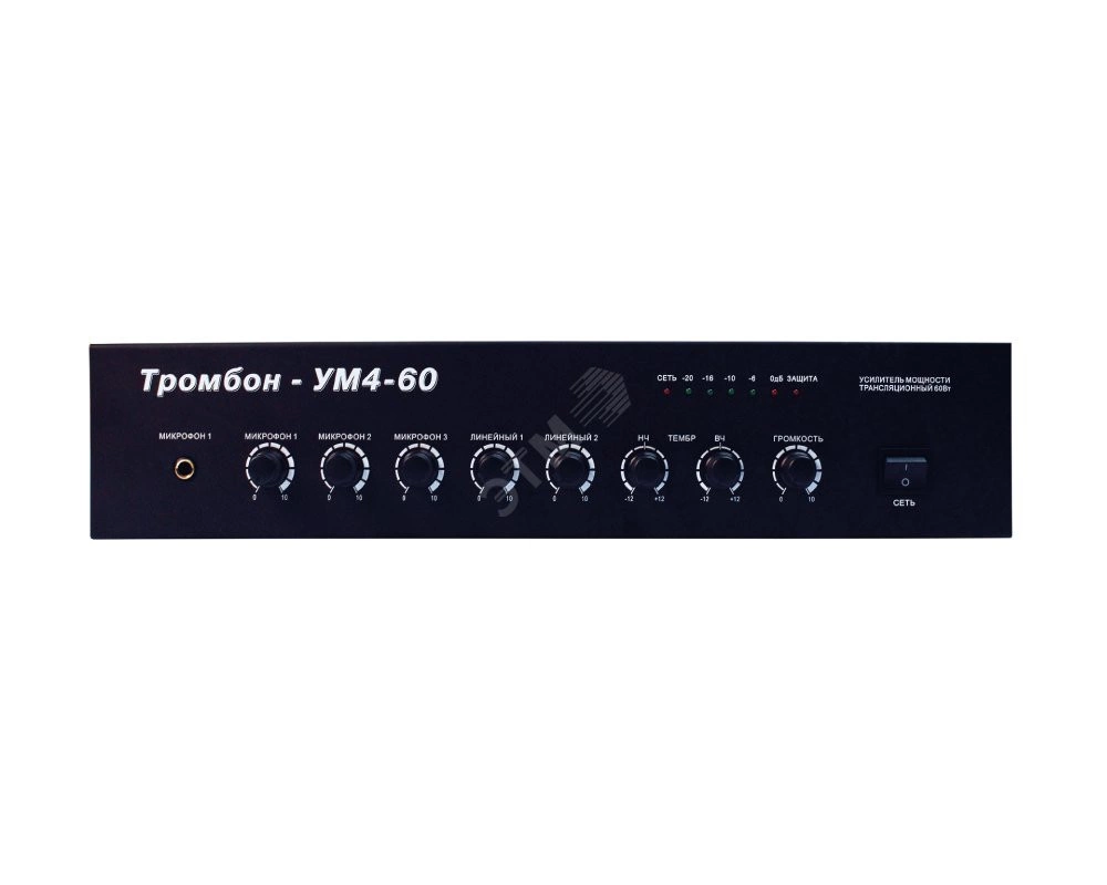 Усилитель малой мощности ''Тромбон УМ-60'' предназначен для использования в составе систем оповещения людей о пожаре в зданиях и сооружениях и систем внутриобъектовой радиотрансляции. Выполняет усиление сигналов от различных источников. Преимущества - - Пять входов - ''Линейный вход 1'', ''Линейный вход 2'', ''Микрофон 1'', ''Микрофон 2'', ''Микрофон 3'' - Регулировка уровня по всем входам и регулировка тембра по низким и высоким частотам - Вход ''Микрофон 1'' имеет приоритет над остальными входами. При подключении к этому входу микрофона и подачи через него речевого сообщения все остальные входы отключаются