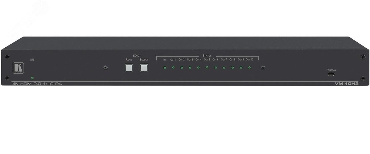 VM-10H2 - усилитель-распределитель сигналов интерфейса HDMI 2.0 разрешением до UHD 4K/60 включительно, совместимый с технологией защиты цифрового контента HDCP 2.2. Он выполняет перетактирование сигнала и компенсацию АЧХ кабеля, после чего выдает идентичный сигнал на десять выходов одновременно. Сигналы управления CEC выдаются только на первый выход. Управление устройством осуществляется по RS-232.