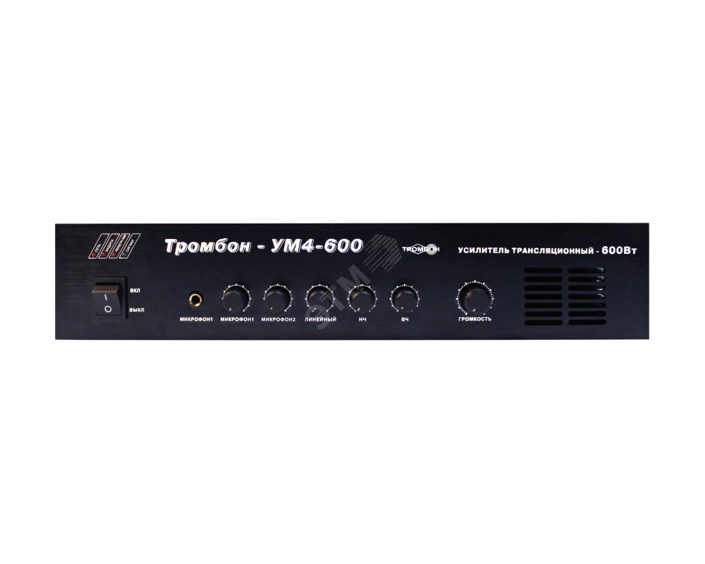 Усилители высокой мощности ''Тромбон УМ-600'' предназначены для усиления звуковых сигналов при работе в составе систем оповещения людей о пожаре. Преимущества - - Четыре входа - ''Линейный вход'', ''Оповещение'', ''Микрофон 1'', ''Микрофон 2'' - Выход ''Выход оповещения'' для каскадного соединения усилителей в системе оповещения - Выход ''Линейный выход'' для работы в системах звукового вещания - Регулировка уровня по всем входам, кроме входа ''Оповещение'', а также общая регулировка уровня - Регулировка тембра НЧ и ВЧ