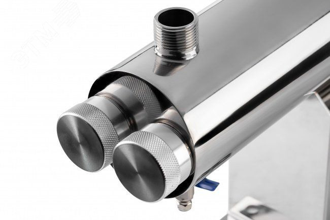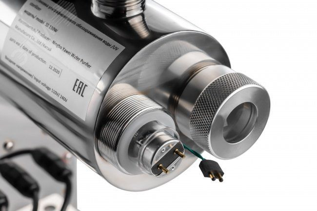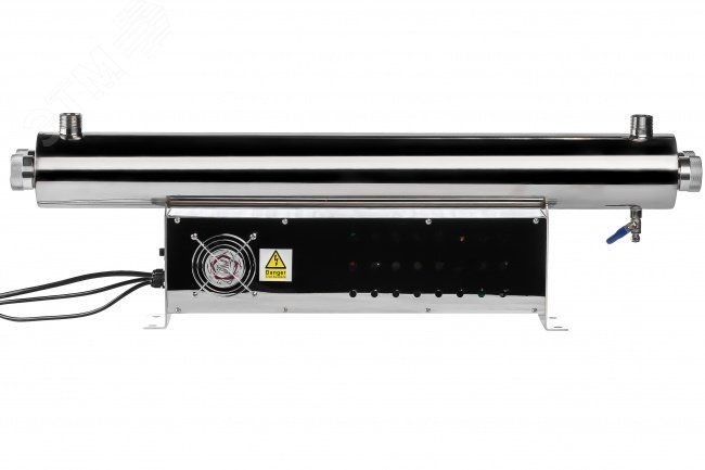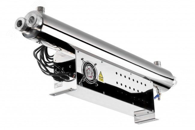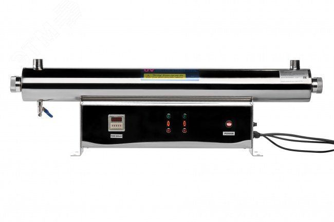 Установки обработки воды ультрафиолетом применяются в случаях, когда необходимо уничтожить или предотвратить размножение патогенной микрофлоры – дезинфицировать воду от бактерий, вирусов, плесени и водорослей. Источником ультрафиолетового излучения служит ультрафиолетовая лампа, устанавливаемая внутри установки герметично, которая стерилизует и обеззараживает воду. Обеззараживание воды нашло широкое применение в подготовке питьевой воды, пищевой промышленности, медицине, в фармацевтическом производстве. Локальные установки обеззараживания используются в конечных точках разбора питьевой воды. 24 gpm, 5,5 м.куб/час.