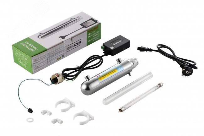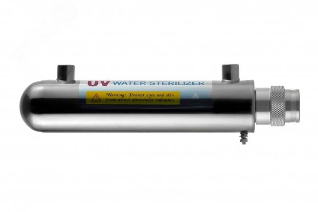 Установки обработки воды ультрафиолетом применяются в случаях, когда необходимо уничтожить или предотвратить размножение патогенной микрофлоры – дезинфицировать воду от бактерий, вирусов, плесени и водорослей. Источником ультрафиолетового излучения служит ультрафиолетовая лампа, устанавливаемая внутри установки герметично, которая стерилизует и обеззараживает воду. Обеззараживание воды нашло широкое применение в подготовке питьевой воды, пищевой промышленности, медицине, в фармацевтическом производстве. Локальные установки обеззараживания используются в конечных точках разбора питьевой воды. 1 gpm, 0,2 м.куб/час.