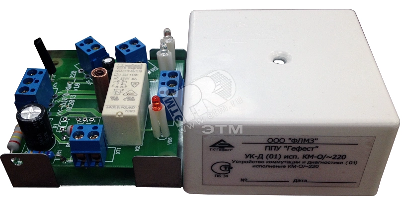 Устройство контроля доступа. Входит в состав многокомпонентного прибора управления пожарного ППУ Гефест и является исполнительным устройством, которое включается в диагностируемую линию связи управляющего устройства - центральный блок, устройств контроля линий связи и пуска УКЛСиП(Б) или УКЛСиП(РП). Применяется для включения / отключения устройств промышленной и пожарной автоматики.
