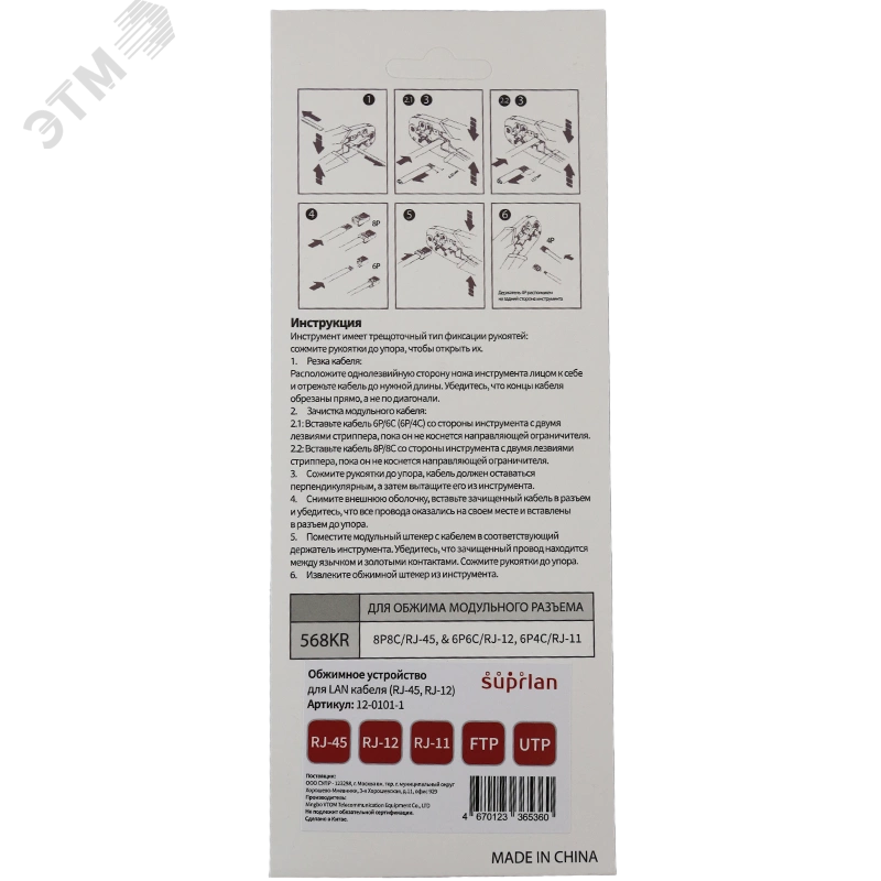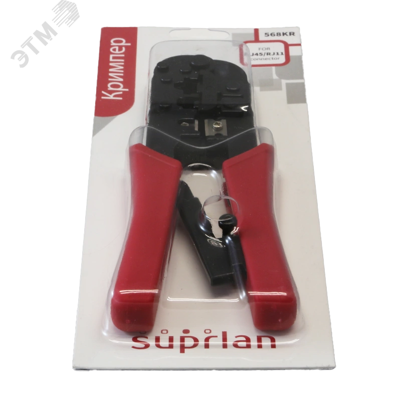Кримпер SUPRLAN SYSTEM - может быть использован для работы как с 8-позиционными, так и с 6-позиционными модульными вилками RJ-45 (8P8C) и RJ-11 (6P4C). В конструкции инструмента предусмотрен резак, используемый для выравнивания концов проводов по длине перед вводом в гнездо вилки, а также снятия оболочки. Заданное усилие давления на контакты и фиксирующий зажим кабельной оболочки обеспечивается применением храпового механизма.