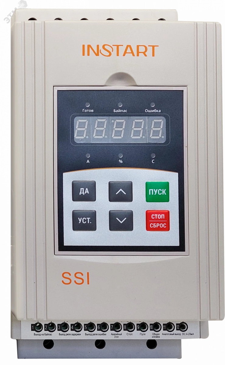 Устройства плавного пуска серии SSI предназначены для плавного запуска асинхронных короткозамкнутых электродвигателей путем постепенного повышения напряжения на статоре двигателя. Снабжены силовыми тиристорными модулями в каждой фазе, включенными по встречно – параллельной схеме, что обеспечивает управление всеми тремя фазами на протяжении полного периода пуска и останова двигателя. Силовая часть устройства выполнена на тиристорах, система управления – цифровая, микропроцессорная. Устройства плавного пуска INSTART применяются в различных областях промышленности, везде, где необходим контролируемый пуск и останов двигателя. Данные устройства могут использоваться как в легких, так и в тяжелых условиях пуска.