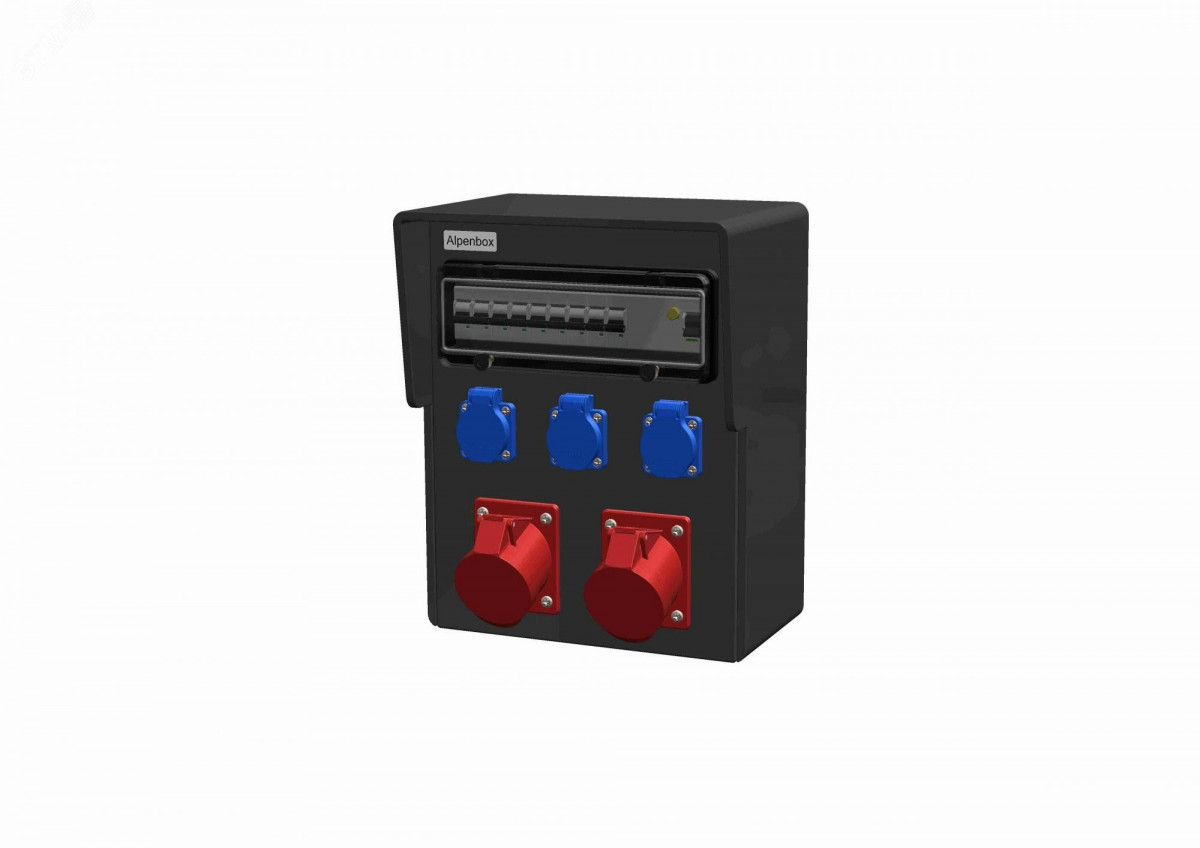 Устройство распределительное AlpenBox. Изделие имеет вход сальник - 2хМ40 и выход розетки Schuko - 3. Выход розетки СЕЕ 32А 5р - 2. Информация по защите - защита на входе - УЗО 4P/63A/30mA. Защита на выходе - автоматический выключатель - 32A/3p - 2шт. 16A/1p - 3шт. Вариант исполнения изделия настенный. Размеры корпуса составляют 298x370x203.