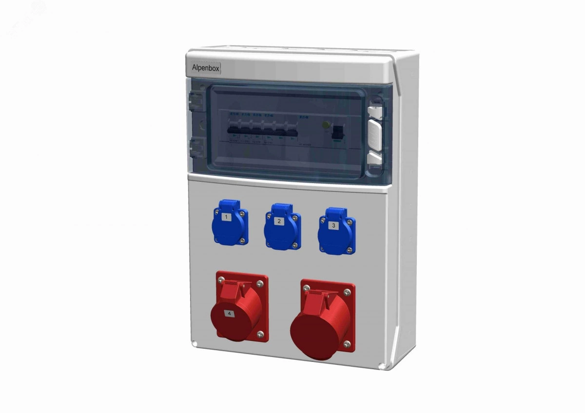Устройство распределительное AlpenBox, настенное, пластик. Вход сальник - М32. Выход розетки Schuko - 3 шт, розетки СЕЕ 16А 5р - 1 шт, розетки СЕЕ 32А 5р - 1 шт. Защита на входе - УЗО 4P/40A/30mA, авт выкл - 16A/1p - 3шт. 16A/3p - 1шт. Размеры корпуса составляют 310x436x148.