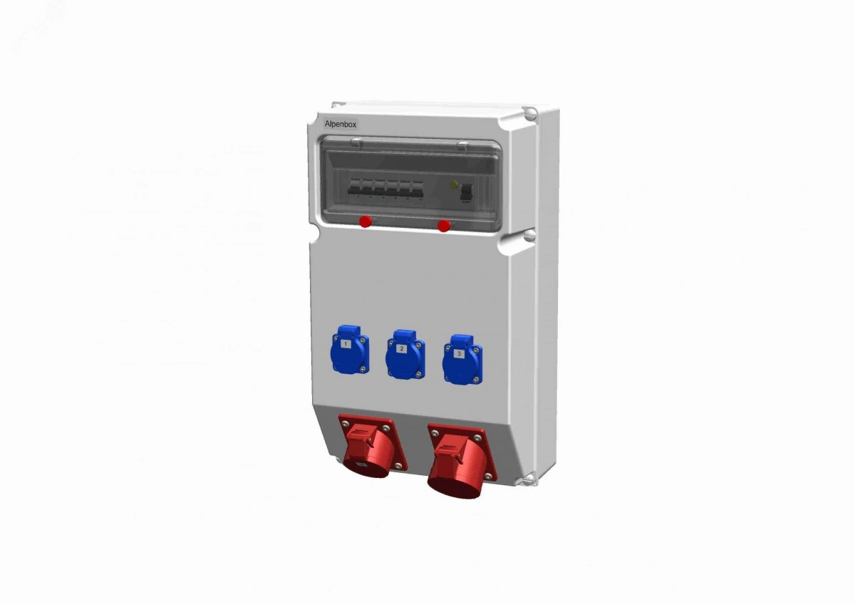 Распределительное устройство AlpenBox, настенное, пластик. Степень защиты изделия IP44. Вход сальник - М32. Выход розетки Schuko - 3 шт, розетки СЕЕ 16А 5р - 1 шт, розетки СЕЕ 32А 5р - 1 шт. Защита на входе - УЗО 4P/40A/30mA. Защита на выходе - автоматический выключатель - 16A/1p - 3шт. 16A/3p - 1шт. Размеры корпуса составляют 297x504x177.
