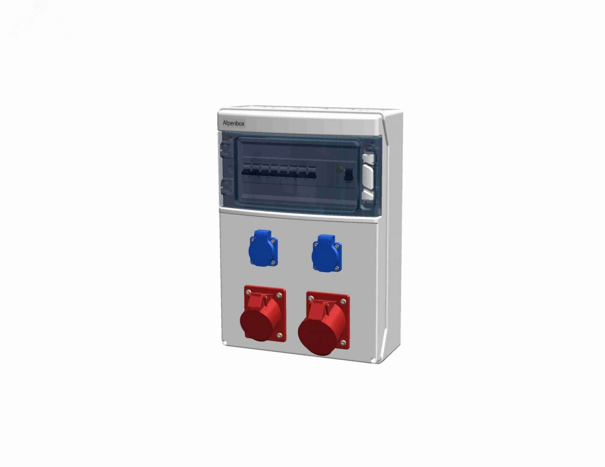 Устройство распределительное AlpenBox, настенное, пластик. Изделие имеет вход сальник - М25, УЗО 4P/40A/30mA. На выходе розетки Schuko - 2, розетки СЕЕ 16А 5р - 1, розетки СЕЕ 32А 5р - 1. Защита на выходе - автоматический выключатель - 32A/3p - 1шт. 16A/1p - 2шт. 16A/3p - 1шт. Размеры корпуса составляют 310x436x148. Степень защиты изделия IP44.