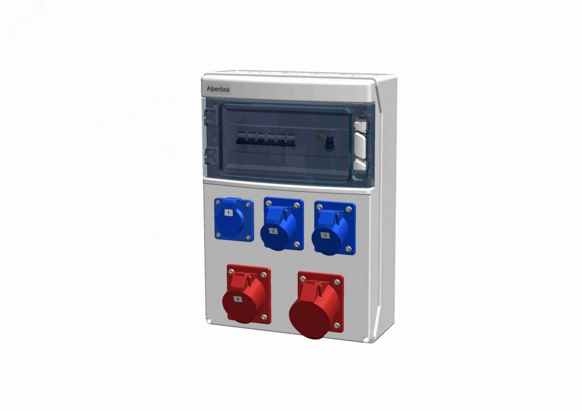 Устройство распределительное AlpenBox, настенное, пластик. На входе сальник - М32, УЗО 4P/40A/30mA. На выходе розетки Schuko - 1, розетки СЕЕ 16А 3р - 2, розетки СЕЕ 16А 5р - 1, розетки СЕЕ 32А 5р - 1 шт. Защита на выходе - автоматический выключатель - 16A/1p - 3шт. 16A/3p - 1шт. Размеры корпуса составляют 310x436x148. Степень защиты изделия IP44.