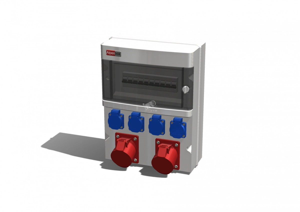 Устройство распределительное AlpenBox, настенное, пластик. На входе сальник - М40. На выходе розетки Schuko - 4, розетки СЕЕ 32А 5р - 2. Защита на выходе - автоматический выключатель - 32A/3p - 2шт. 16A/1p - 4шт. Размеры корпуса составляют 310x436x148. Степень защиты изделия IP44
