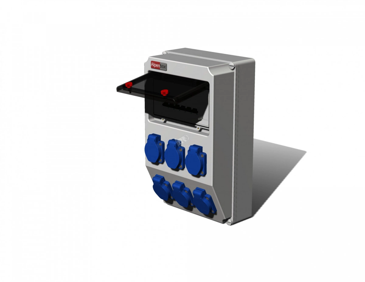 Устройство распределительное AlpenBox, настенное, пластик. Изделие имеет вход сальник - М25 и выход розетки Schuko - 6. Информация по защите - защита на выходе - автоматический выключатель - 16A/1p - 6шт. Размеры корпуса составляют 222x369x130. IP 54.