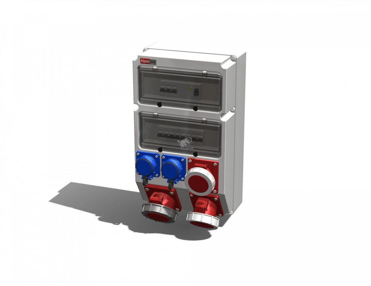 Устройство распределительное AlpenBox, настенное, пластик. На входе сальник - М40, УЗО 4P/63A/30mA+Автоматический выключатель 3P 63A. На выходе розетки Schuko - 2, розетки СЕЕ 16А 5р - 1, розетки СЕЕ 32А 5р - 1, розетки СЕЕ 63А 5р - 1. Защита на выходе - автоматический выключатель - 32A/3p - 1шт. 16A/1p - 2шт. 16A/3p - 1шт. Размеры корпуса составляют 297x504x177. IP 67