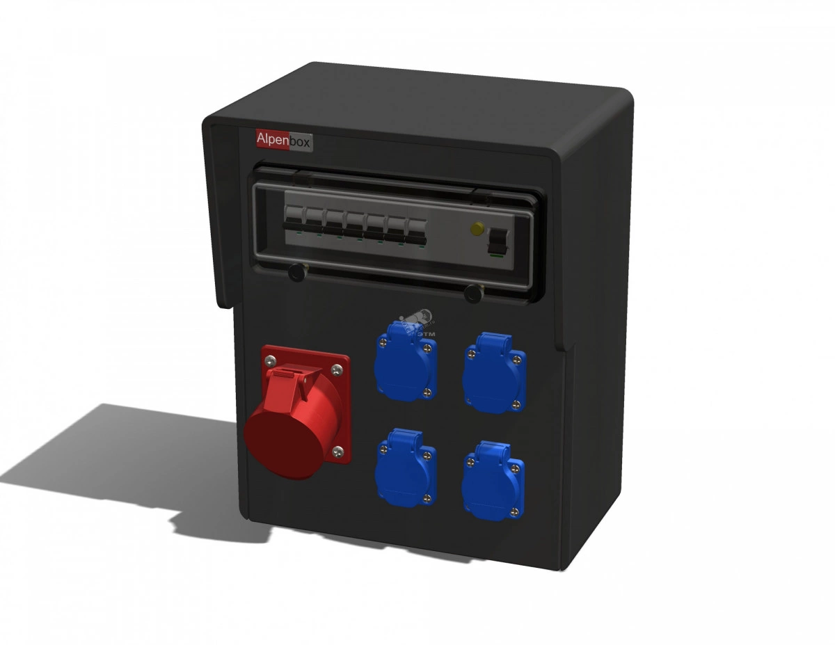 Устройство распределительное AlpenBox, настенное. На входе сальник - М40. Выход розетки Schuko - 4, розетки СЕЕ 32А 5р - 1 шт. Защита на входе - УЗО 4P/63A/30mA. Защита на выходе - автоматический выключатель - 32A/3p - 1шт. 16A/1p - 4шт. Материал корпуса - твердая резина. Степень защиты изделия IP44.