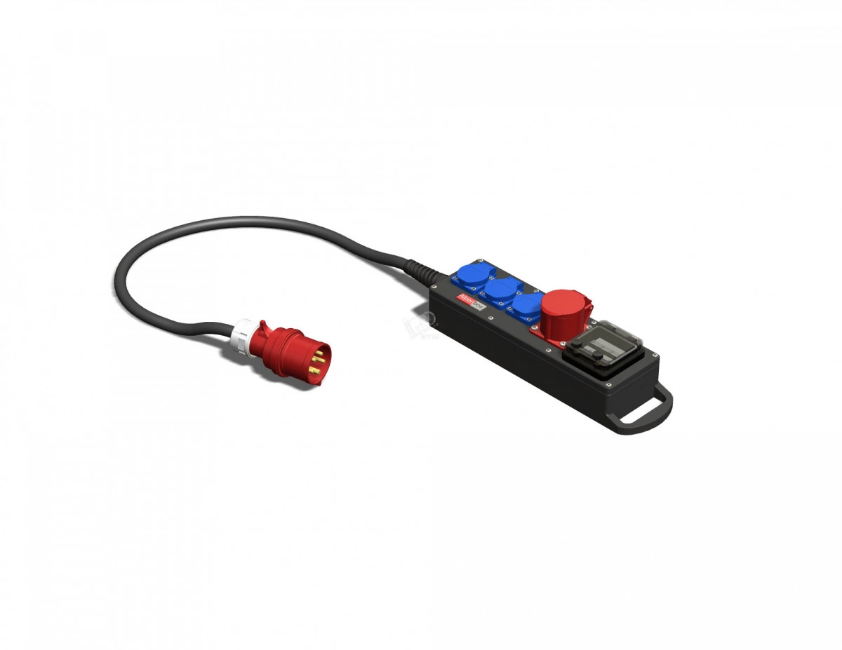 Устройство распределительное AlpenBox. На входе вилка CEE 32A/5p. Кабель H07RN-F 3G4 - 3м. Выход розетки Schuko - 3, розетки СЕЕ 16А 5р - 1. Информация по защите - защита на входе - автоматический выключатель 3P 32A. Вариант исполнения изделия переносной. Размеры корпуса составляют 430х72х115. Степень защиты изделия IP44