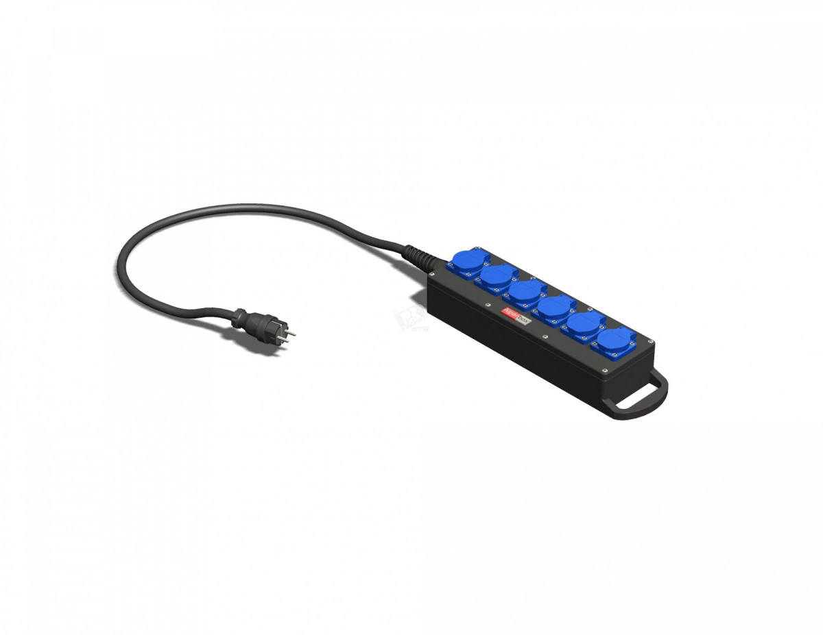 Устройство распределительное AlpenBox. На входе вилка DIN 16А/2р+E. Кабель гибкий резиновый H07RN-F 3G2, 5 - 5м. Выход розетки Schuko - 6. Вариант исполнения изделия переносной. Размеры корпуса составляют 430х72х115. Степень защиты изделия IP44