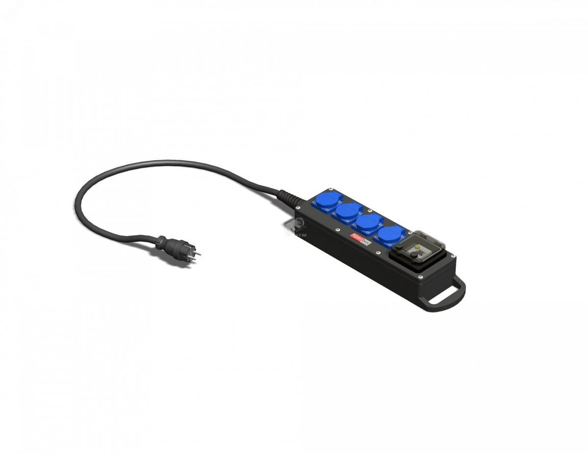 Устройство распределительное AlpenBox, переносное. Изделие имеет выход розетки Schuko - 4. Информация по защите - защита на входе - Дифф.Авт. 2P/16A/30mA. Размеры корпуса составляют 430х72х115. Степень защиты изделия IP44