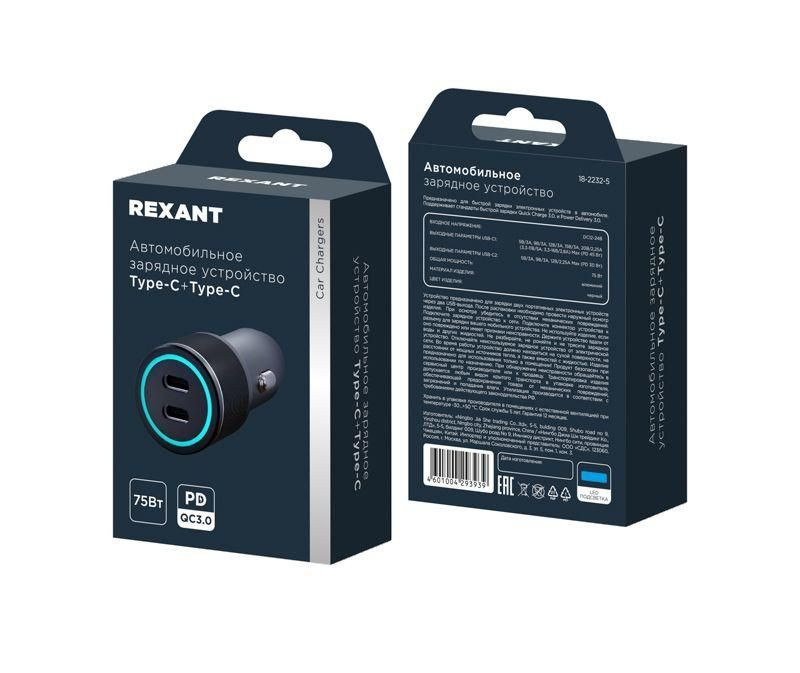 Полное описание: Устройство зарядное автомобильное c двумя портами (USB-C + USB-С) c LED-подсветкой 75Вт Rexant 18-2232-5
