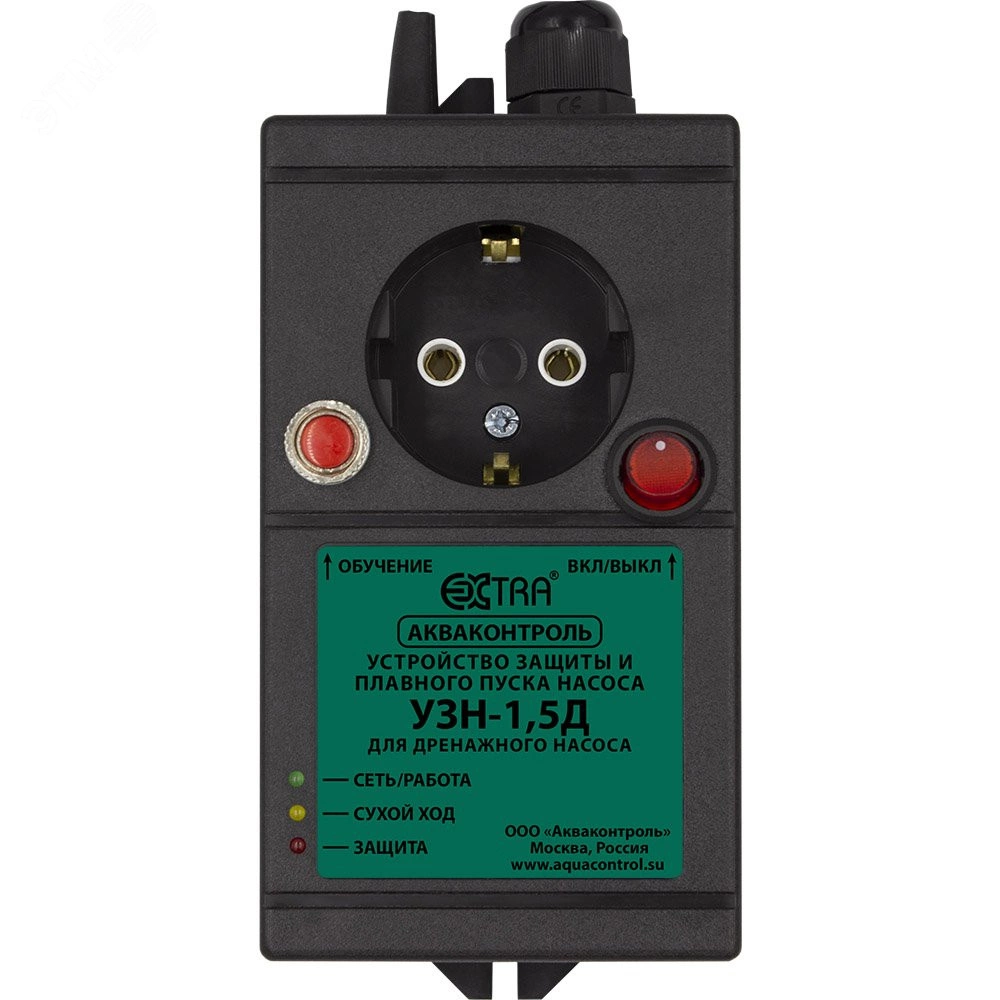 Предназначено для защиты дренажного насоса от сухого хода и перегрузок по току и напряжению а так же плавного пуска/остановки. Имеет функцию обучения. Максимальная мощность насоса 1500 Вт. Устройство защиты насоса обладает возможностью отключения защиты по напряжению, защитой от заклинивания вала, защитой от перегрузок по току и КЗ, защитой от сухого хода, возможностью отключения защиты по сухому ходу, а также возможностью выбора графика плавного пуска
