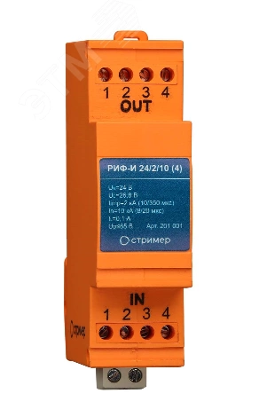 УЗИП комбинированного типа для защиты оборудования слаботочных цепей. Предназначено для защиты оборудования распределенных сетей аппаратуры промышленнои автоматизации (АСУ ТП, АСКУЭ и др.), цифровых интерфейсов передачи данных TTY, RS-485, RS-422, сигнальных линий систем управления и измерения, для защиты источников питания 24 В программируемых логистических контроллеров (ПЛК).Устанавливается на границах 1– 2 зон молниезащиты. УЗИП размещено в корпусе шириной 27 мм для крепления на DIN-рейку 35 мм. Количество защищаемых проводников – 4, подключение с помощью винтовых клемм.