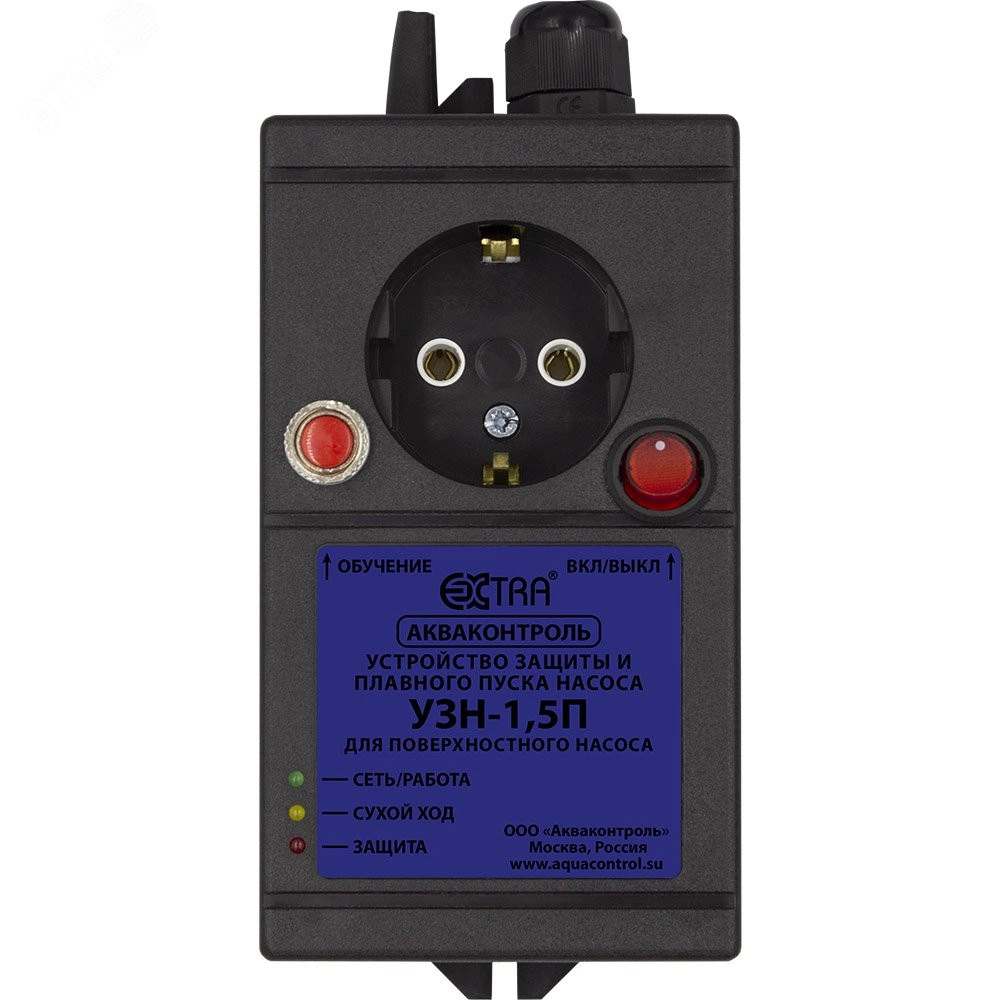 Предназначено для защиты поверхностного насоса от сухого хода и перегрузок по току и напряжению а так же плавного пуска/остановки. Имеет функцию обучения. Максимальная мощность насоса 1500 Вт. УЗН предназначен для эксплуатации в зонах умеренного/холодного климата, в закрытых помещениях без искусственного регулирования климатических условий и отсутствия воздействия рассеянного солнечного излучения и конденсации влаги.