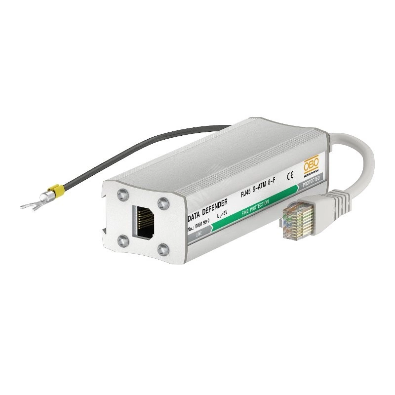 Универсальное устройство для защиты систем передачи данных, сетевой техники и телекоммуникационных сетей., Средняя/выборочная защита отдельных объектов., В алюминиевом корпусе., Защита 8 линий., С двухступенчатой схемой защиты., Простой монтаж., С соединителем RJ 45., Включ. соединительную линию 150 мм со штекерным соединителем RJ 45., Для сетевой техники Cat 5 и Cat 6., С 5 летней гарантией. Область применения: для аналоговых систем, сетей ISDN , DSL и Ethernet Twisted Pair.