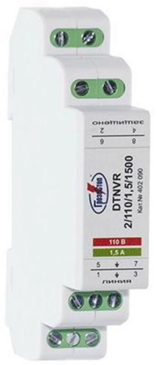 Полное описание: УЗИП ГРОЗОСТОП DTNVR 1/110/1,5/1500, Uо - 110 В, IL - 1,5 А, In (8/20) - 20 кА.