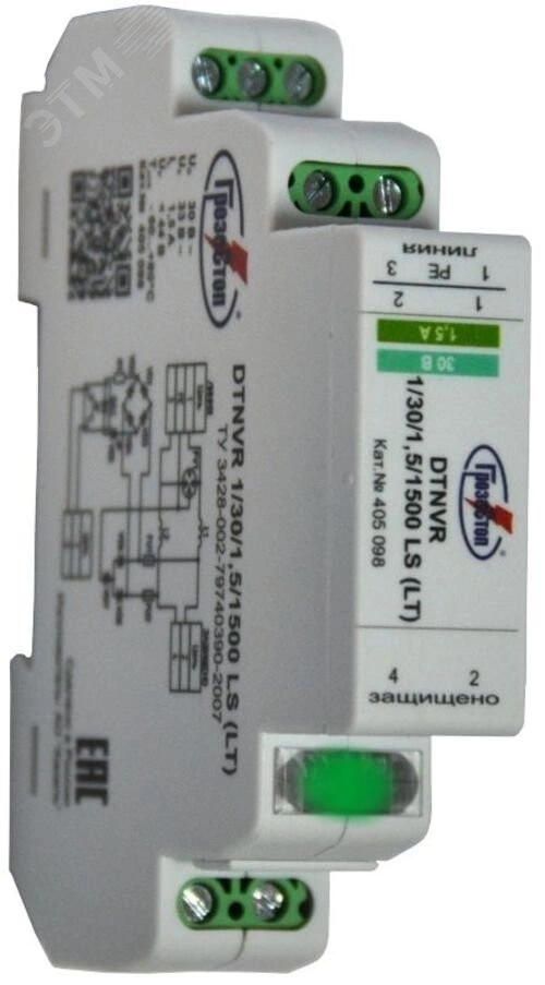 Полное описание: УЗИП ГРОЗОСТОП DTNVR 1/30/1,5/1500 LS, Uо - 30 В, IL - 1,5 А, In (8/20) - 20 кА.