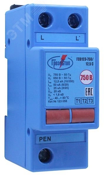 Полное описание: УЗИП ГРОЗОСТОП ГСВ123-600/12,5 С, класс испытаний I, II, III, UO=600/780 В, Iimp(L/N) (10/350)= 12.5 кА, In(8/20)=20 кА
