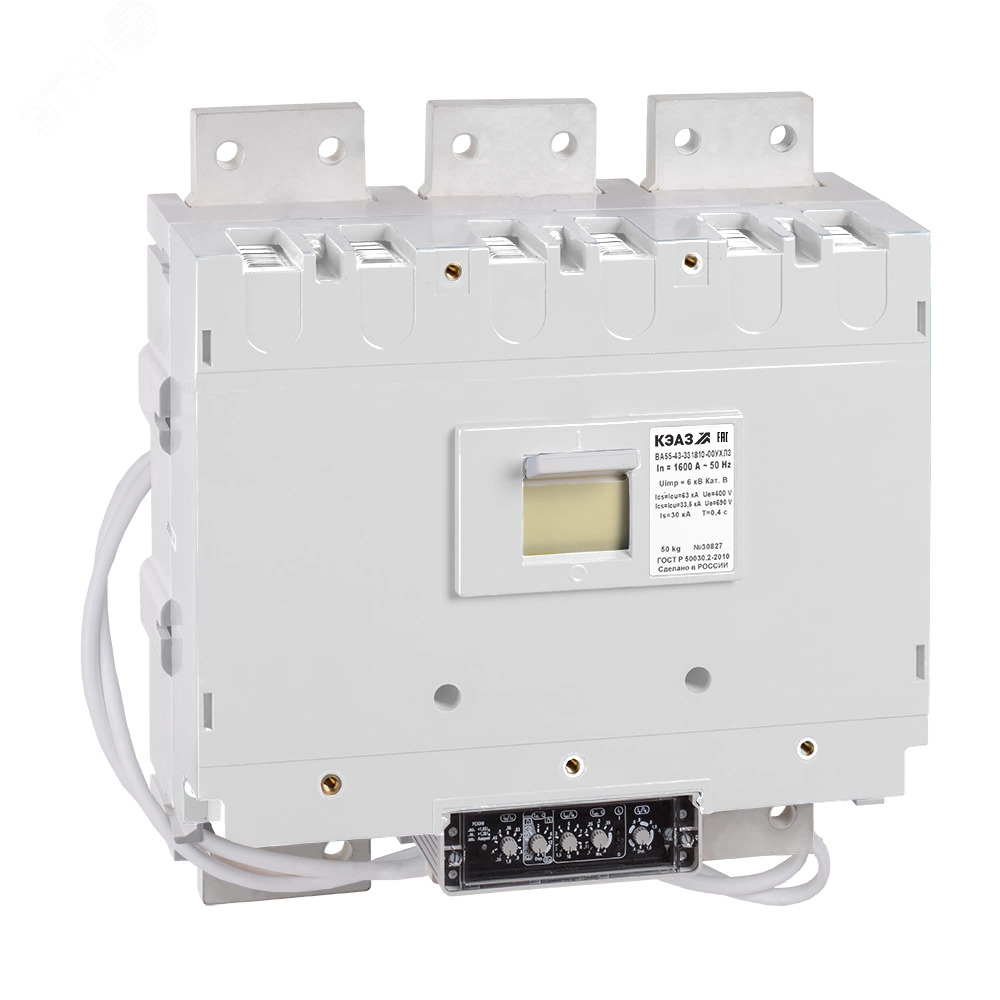 Силовой 3 полюсный автоматический выключатель переменного тока в литом корпусе на номинальный ток 1600 А. Выключатели КЭАЗ предназначены для применения в электрических цепях переменного тока частоты 50, 60 Гц напряжением 690 В, для нечастых оперативных включений и отключений (до 6 в час), указанных цепей и защиты электрооборудования от перегрузок и коротких замыкании, а также нечастых прямых пусков асинхронных двигателей. Выключатели изготавливаются с полупроводниковым максимальным расцепителем тока на базе микроконтроллера Atmega 16L.