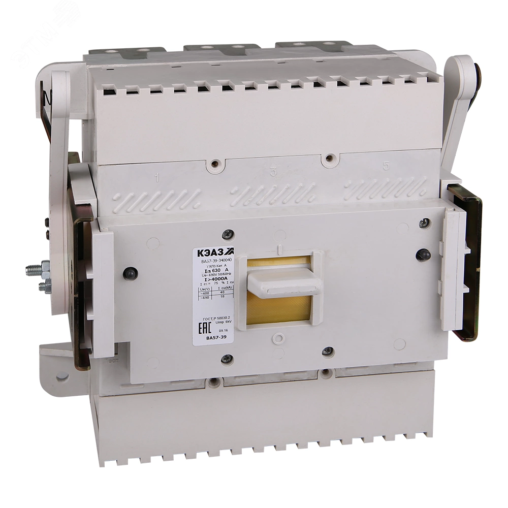 Силовой 3 полюсный автоматический выключатель переменного тока в литом корпусе на номинальный ток 320 А. Трехполюсные автоматические выключатели КЭАЗ типа ВА 57-39 предназначены для применения в электрических цепях с напряжением 400 / 690 В переменного тока частотой 50 и 60 Гц и 440В постоянного тока, их защиты от токов короткого замыкания, токов перегрузки, недопустимых снижений напряжения, а также для нечастых оперативных включений и отключений.