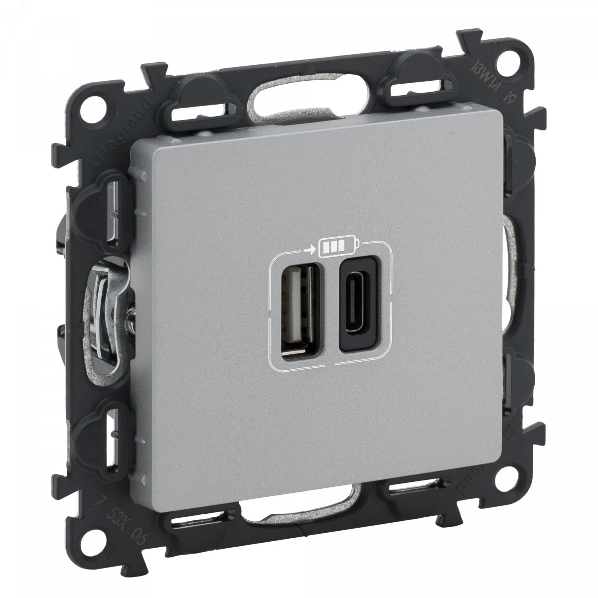 Valena LIFE.Зарядное устройство с двумя USB-разьемами тип A-тип С 240В/5В 3000мА.С лицевой панелью.Цвет Алюминий