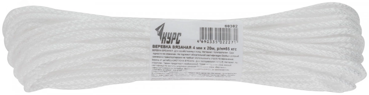 Веревка вязаная полипропиленовая, 4 мм х 20 м, р/н= 65 кгс