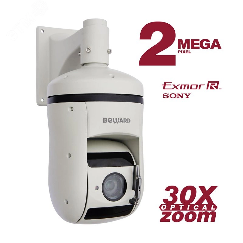 Скоростная купольная IP-камера B57-30RW в погодоустойчивом корпусе обеспечивает потрясающее качество съемки с разрешением 2 Мп. На любых объектах с обширной открытой территорией, где присутствует разноконтрастное освещение, требуется быстрый панорамный обзор и съемка мелких деталей с помощью зума, PTZ-камера B57-30RW находит свое применение. IP-камера B57-30RW оснащена 2 Мп КМОП-матрицей Exmor, которая более эффективно использует световой поток, падающий на матрицу. В итоге чувствительность камеры достигает 0.002 лк (в режиме ночь). Матрица Exmor R отличается усовершенствованной системой снижения шумов. Высокие показатели по этим параметрам становятся особо важными в условиях низкой освещенности. Они же определяют возможности оператора качественно выполнять функции обнаружения и идентификации.