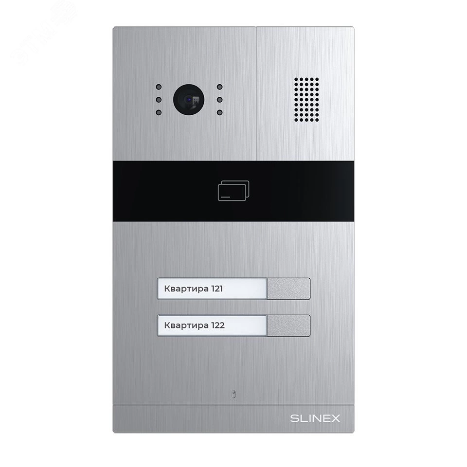 Slinex MA-02 – это вызывная панель на 2 абонента в ультрасовременном дизайне. Панель имеет множество достоинств, среди них - цветная CMOS камера с разрешением 960 ТВЛ, встроенный комбинированный считыватель бесконтактных карт EM-Marin, MIFARE, механический ИК фильтр на 6 светодиодов и подсветка именных табличек.