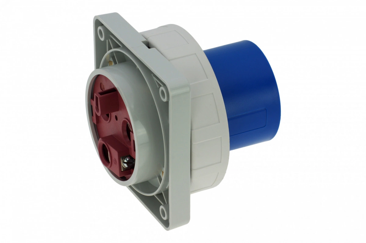 Вилка встраиваемая 125A/230V/1P+N+E/IP67, фланец 130x130, имеет винтовые контакты, выполнены из латуни, материал корпуса розетки - полиамид