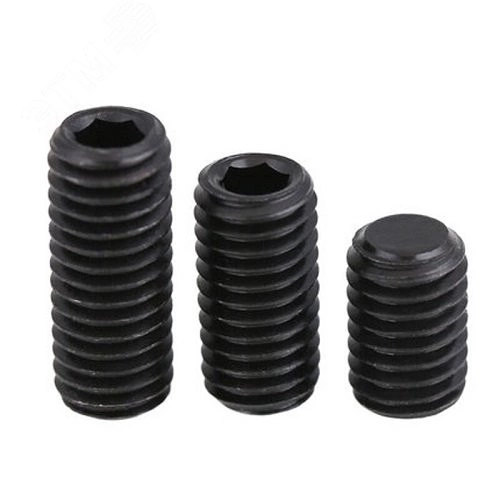 Винт установочный с внутренним шестигранником и плоским концом с диаметрами резьбы от 1,4 до 24 мм. Применяется для осевой и радиальной фиксации на валах внутри механизмов, станков, автомобильных (и не только) моторов, различных конструкций мебельной и строительной промышленности.