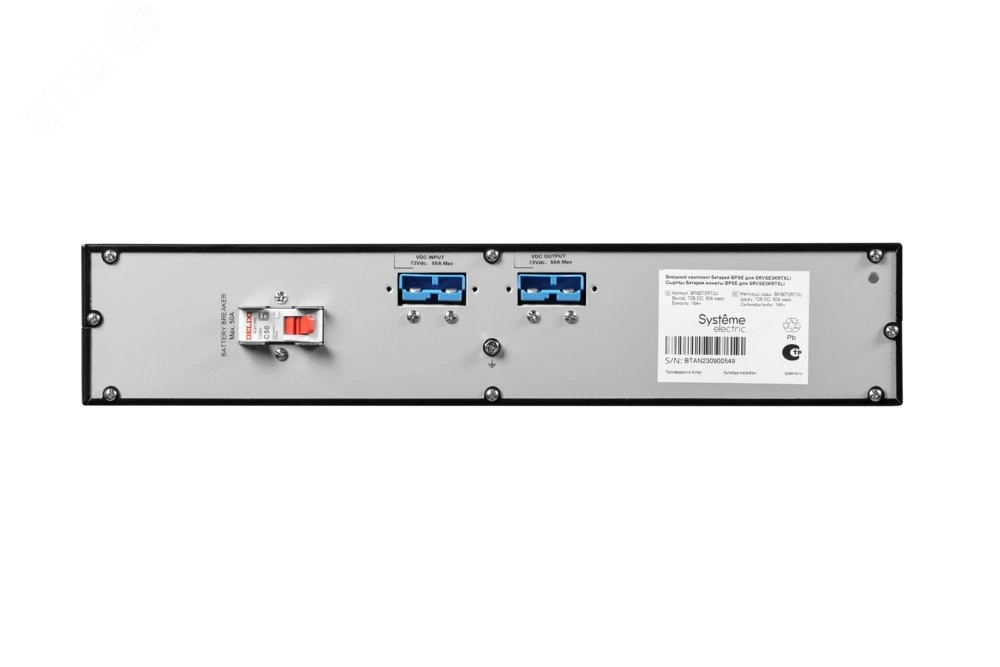 Во внешнем батарейном блоке BPSE72RT2U используются свинцово-кислотные аккумуляторы, которые имеют высокий уровень защиты от утечек. Батарейный блок удобен в установке и демонтаже. Он предназначен для ИБП Systeme Electric серий SRVSE и STRSE.