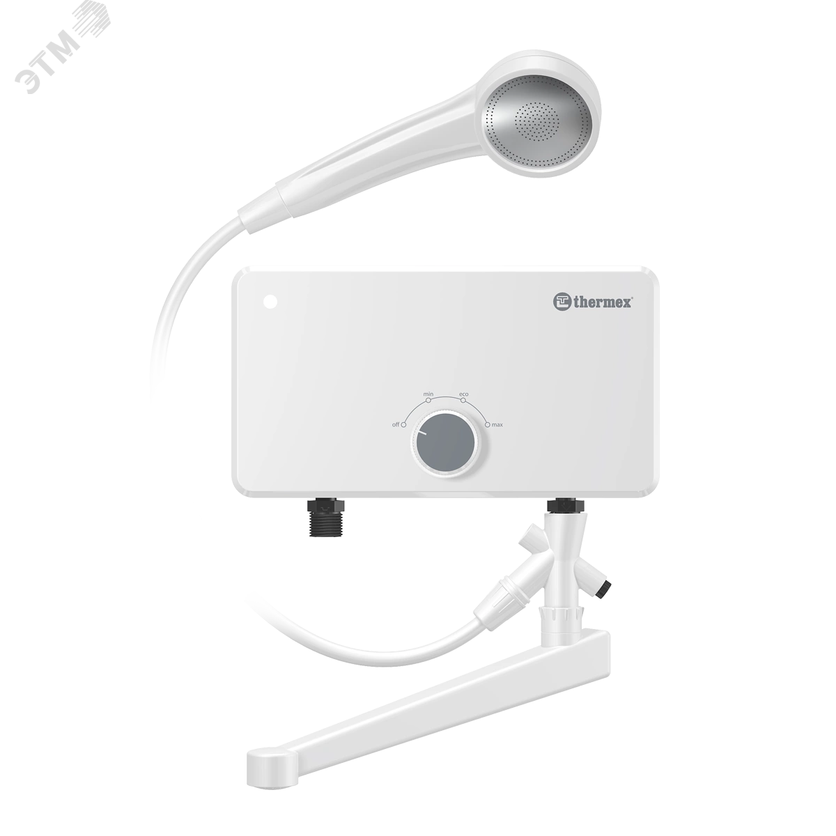 Для одной точки водоразбора, медный нагревательный элемент, колба из термостойкого пластика, моментальная подача воды, гарантия 1 год, в комплекте излив и душевой набор