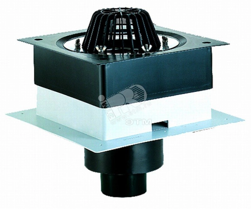 Кровельная воронка с листвоуловителем, с теплоизоляцией, с обжимным фланцем, с возможностью изменения высоты монтажного короба от 100-160 мм, с вертикальным выпуском.