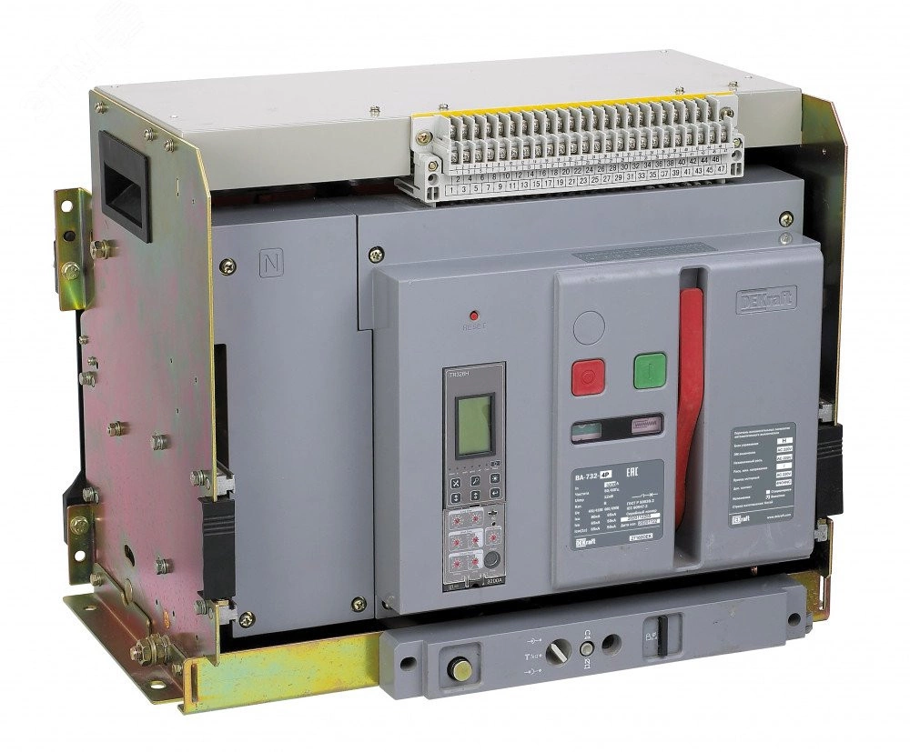 Воздушный автоматический выключатель серии ВА-732 DEKraft - 4P, номинальный ток 2000 А - отключающая способность 80 кА, выкатной, блок управления типа H - присоединения задние горизонтальные. В базовую комплектацию входят моторный привод (230 В пер.тока), 4 контакта состояния ВКЛ/ОТКЛ, сигнальный контакт, электромагнит включения (230 В пер.тока), независимый расцепитель (230 В пер.тока), сигнальный контакт положения аппарата в корзине, разделители полюсов и рамка передней панели. Выключатели с блоком управления типа H позволяют осуществлять мониторинг и диспетчеризацию защищаемой сети и нагрузок.
