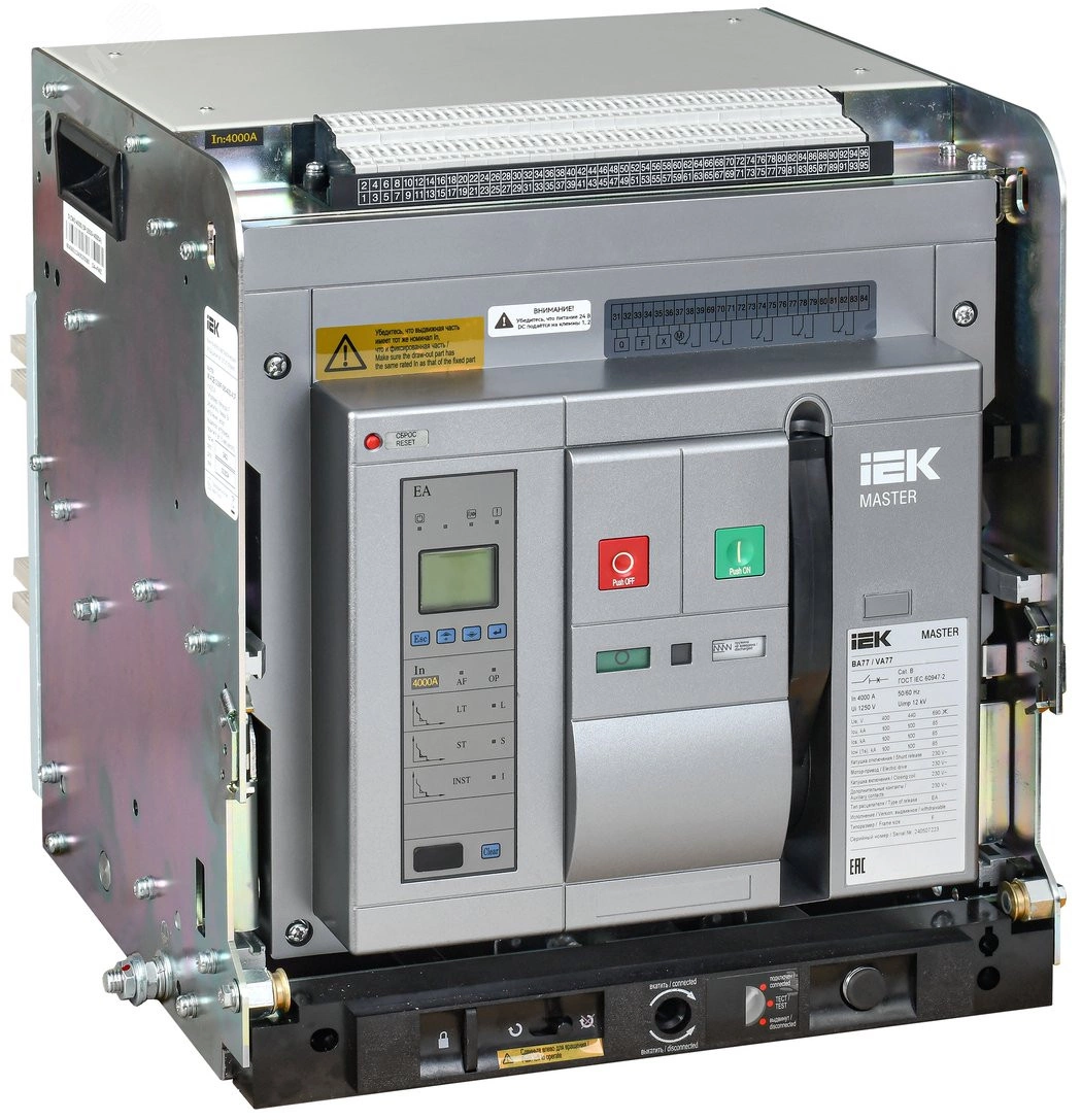 Воздушные автоматические выключатели серии MASTER IEK предназначены для защиты сетей низкого напряжения от коротких замыканий и перегрузок. Автоматические выключатели данной серии обладают оптимальным набором функций, для применения их на объектах жилищного, социального, коммерческого и дорожного строительства, а также энергетики и сельского хозяйства. Воздушные автоматические выключатели серии MASTER IEK поставляются укомплектованными набором аксессуаров для их полноценного применения в состав НКУ: мотор привод 230В, реле включения и отключения (с удержанием) 230В, контакт положения в корзине, набор из 4х перекидных контактов, аварийный контакт. В комплект автоматического выключателя также входит электронный контроллер и, в случае выдвижного исполнения база выдвижного исполнения.