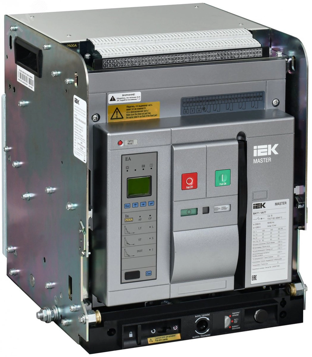 Воздушные автоматические выключатели серии MASTER IEK предназначены для защиты сетей низкого напряжения от коротких замыканий и перегрузок. Автоматические выключатели данной серии обладают оптимальным набором функций, для применения их на объектах жилищного, социального, коммерческого и дорожного строительства, а также энергетики и сельского хозяйства. Воздушные автоматические выключатели серии MASTER IEK поставляются укомплектованными набором аксессуаров для их полноценного применения в состав НКУ: мотор привод 230В, реле включения и отключения (с удержанием) 230В, контакт положения в корзине, набор из 4х перекидных контактов, аварийный контакт. В комплект автоматического выключателя также входит электронный контроллер и, в случае выдвижного исполнения база выдвижного исполнения.