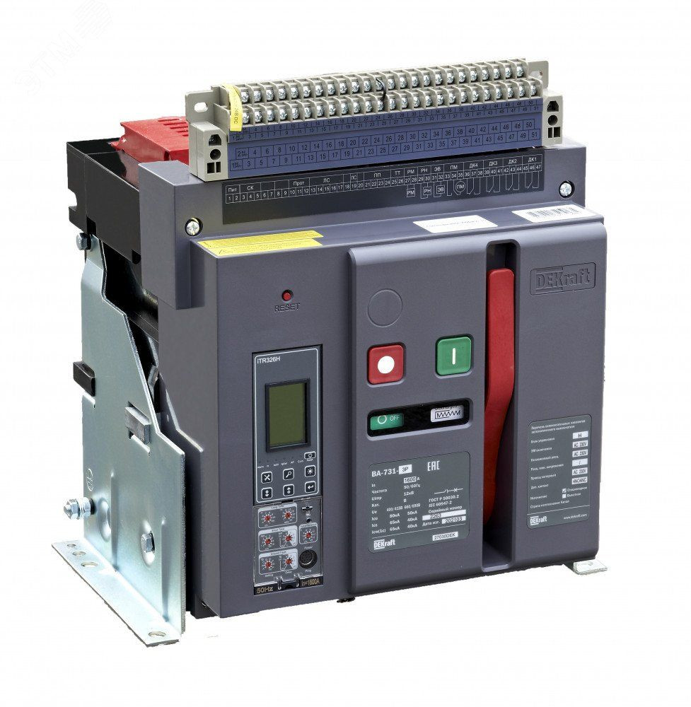 Воздушный автоматический выключатель серии ВА-731 DEKraft - 3P, номинальный ток 630 А - отключающая способность 80 кА, стационарный, блок управления типа H - присоединения задние горизонтальные. В базовую комплектацию входят моторный привод (230 В пер.тока), 4 контакта состояния ВКЛ/ОТКЛ, сигнальный контакт, электромагнит включения (230 В пер.тока), независимый расцепитель (230 В пер.тока), разделители полюсов и рамка передней панели. Выключатели с блоком управления типа H позволяют осуществлять мониторинг и диспетчеризацию защищаемой сети и нагрузок.