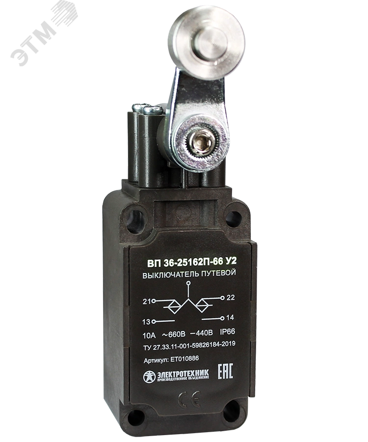 Полное описание: ВП 36-2516П-66 У2, рычаг со стальным роликом, 1з+1р, инерционный, 30х60 мм, без сальника, 3А, IP66, выключатель путевой (ЭТ)