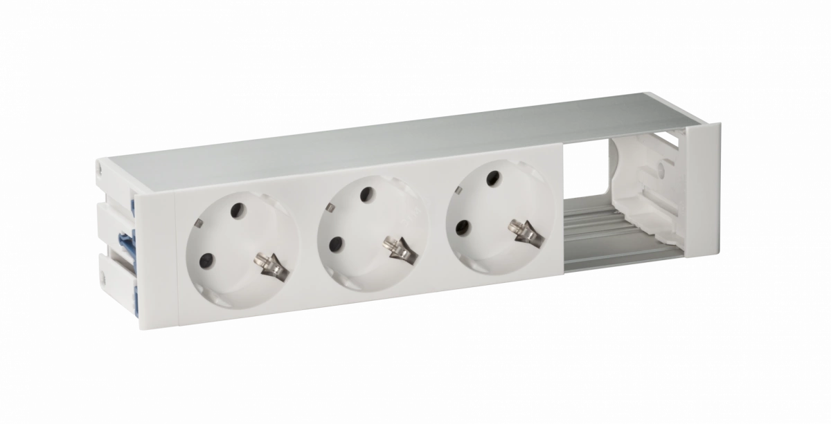 Врезной розеточный блок с крышкой, ввод щетка, 3x2P+E, 1 пустое отверстие, белый, Simon 400